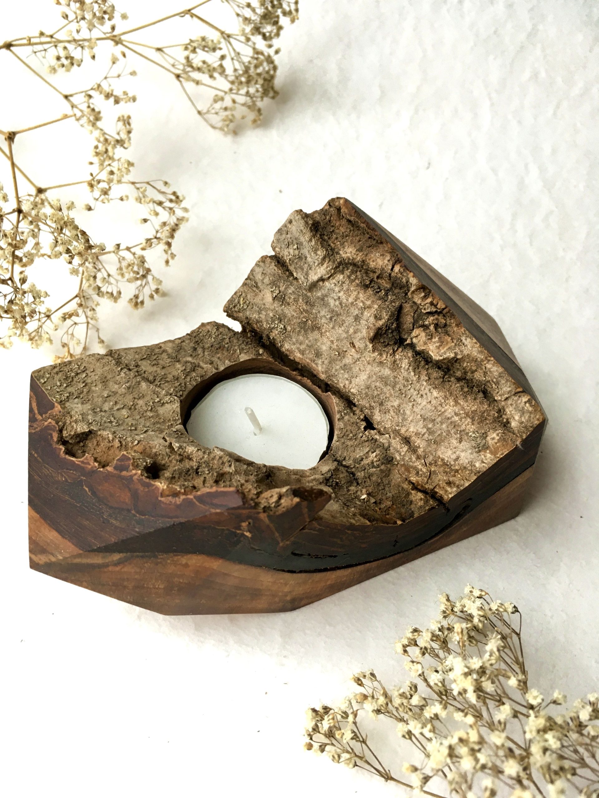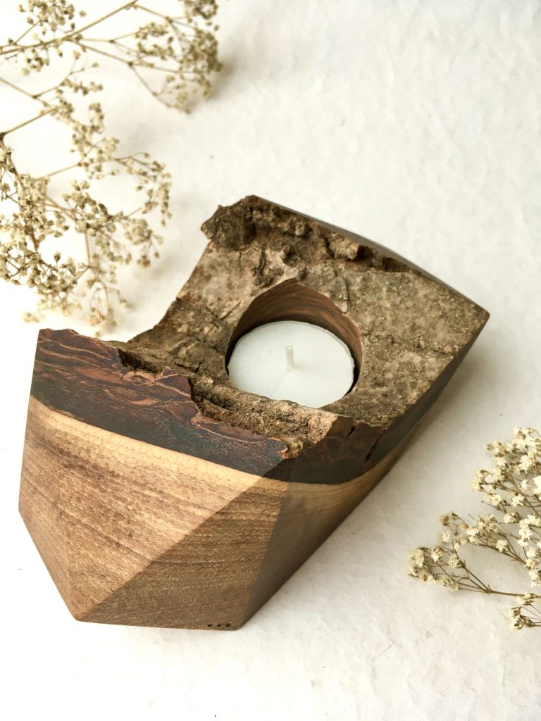 Jeho nepravidelný tvar vychází z tvaru kmene stromu a díky krásné kresbě slouží jako dekorace interiéru i když svíčka zrovna nehoří.